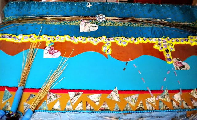 As you can see, I added a brooch and some ribbon embroidery. Also the blue beads were added to give extra dimension to the handmade paper. Red beads used to define the edge.